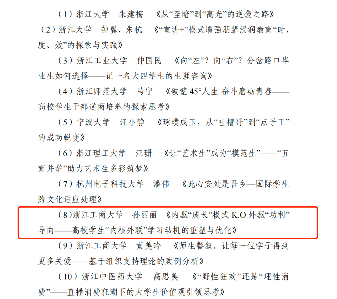 第五届浙江省高校辅导员工作案例大赛评选结果日前揭晓,51黑料孙丽丽老师撰写的《内驱“成长”模式 K.O 外驱“功利” 导向——高校学生“内核外联”学习动机的重塑与优化》喜获浙江省三等奖