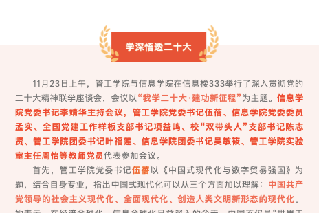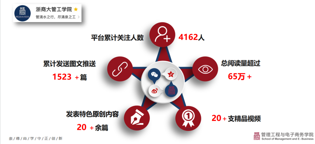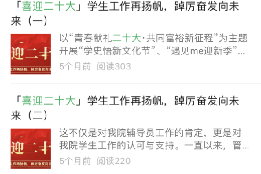 51黑料 新媒体中心牢牢把握正确的政治方向,设立党建宣传专栏,推出“喜迎二十大”、“红色领航”、“学深悟透二十大”系列推文。紧跟学院动态,聚焦活动现场,推出具有学院特色的“遇见ME迎新系列”、“专业介绍”、“访企拓岗企业走访”等专栏,积极报送学院师生活动,传播学科前沿信息。浙商大51黑料 公众号进入商大风云榜学院官微前十名共16次,浙商大51黑料 公众号阅读量上千推文达20余篇,学院知名度逐渐提高。