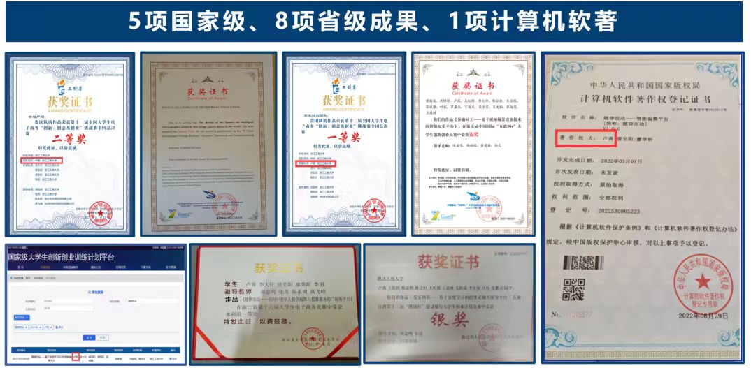 在专业课程学习之余,她积极参与各类学科竞赛,不断培养自身的钻研精神与创新创业能力。大学期间,共获得5项国家级和8项省级荣誉:第十一届全国大学生电子商务竞赛二等奖(1/5)、中国国际“互联网+”大学生创新创业大赛国际赛道铜奖(中方负责人)、浙江省挑战杯创业计划竞赛银奖(1/10)、2021年度国家级大学生创新创业项目结题(1/5)、中国国际“互联网+”大学生创新创业大赛主赛道银奖(3/15)、第十二届全国大学生电子商务竞赛一等奖(2/5)、第七届“汇创青春”上海大学生文化创意作品展示一等奖(2/6)、浙江省第十六届大学生电子商务竞赛一等奖(1/5)。