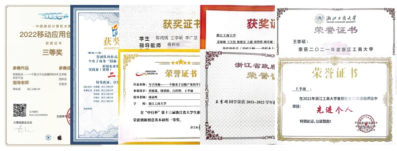 在学习上,成绩优异,曾获得浙江省省政府奖学金、校优秀团员、综合二等奖学金。在科研竞赛上,曾获得全国移动应用创新大赛三等奖、互联网+大学生创新创业大赛铜奖、浙江省大学生电子商务竞赛(常规赛) 本科组一等奖等奖项。在社会实践上,积极参与社会实践和志愿活动,被评为三星级志愿者,曾获得校“双百双进”暑期社会实践优秀个人。