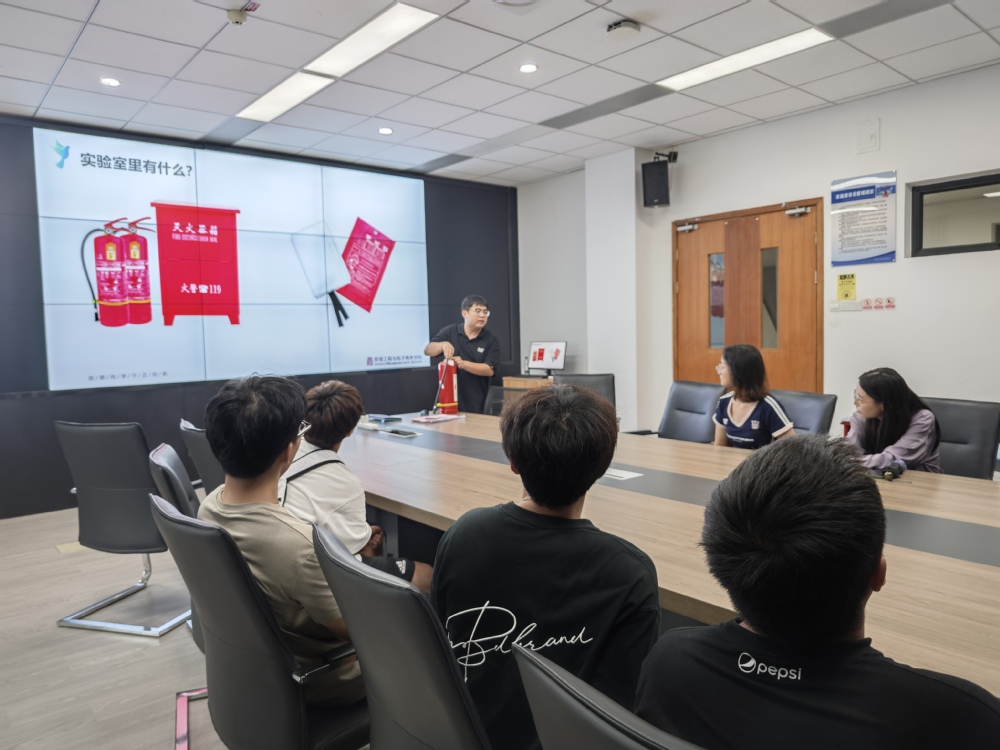 当走进文科实验楼。学院实验管理室安全负责人高国亮老师带领新生们了解前沿科技设施,提前感受同学们平时科研学习的环境与氛围。同时,开展座谈会,为新生们普及实验室安全常识,并演示安全器材使用,为他们在未来的校园生活中应对突发情况提供了必要的知识和技能保障。