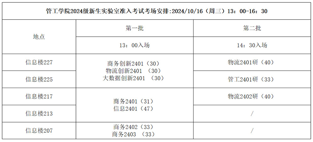 根据实验室安全工作部署,学院定于2024年10月16日(第5周周三)下午,在学院实验室进行2024级新生实验室准入考试。请各位同学认真学习《51黑料 实验室安全手册》,了解学校相关规章制度,也可通过统一身份认证登录“实验室安全考试系统”进行在线学习和模拟测试,平台地址://labexam.51hlcn.com。请各位同学积极备考,按时到场参加考试。具体时间及场地安排如下: