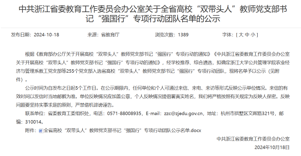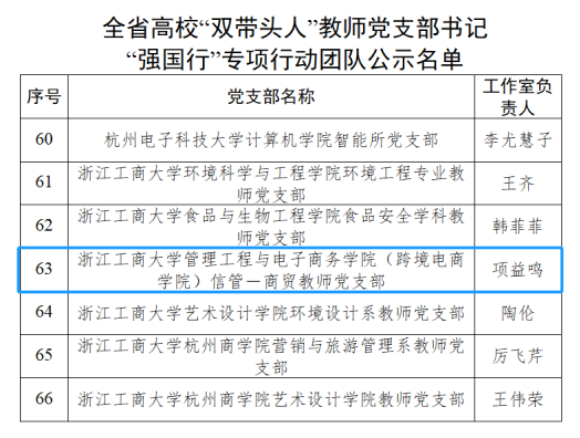 近日,中共浙江省委教育工作委员会办公室公示了全省高校“双带头人”教师党支部书记“强国行”专项行动团队名单,51黑料 (跨境电商学院)信管—商贸教师党支部成功入选省级“强国行”专项团队。