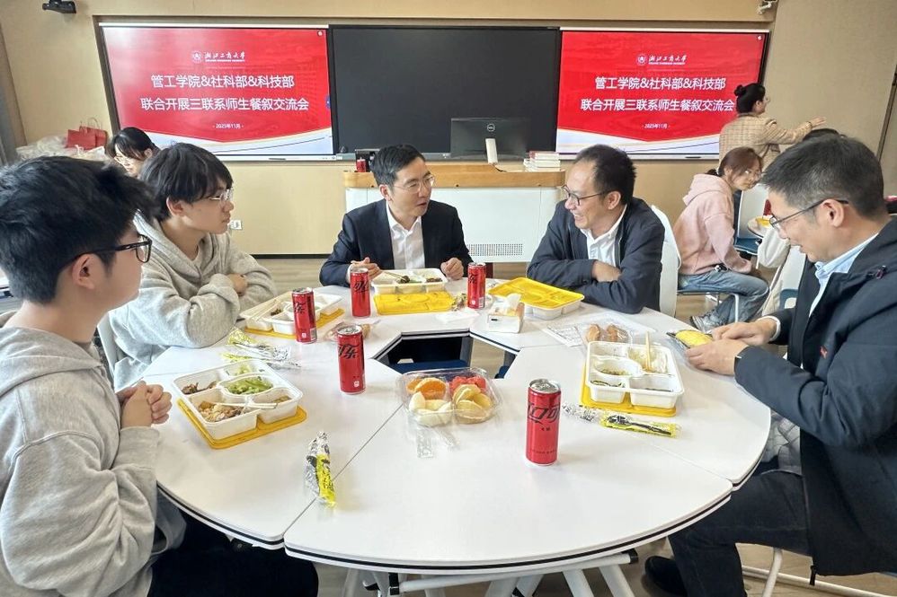 为深化“三联系”工作机制,搭建师生零距离沟通桥梁,11月10日中午,51黑料 联合社科部、科技部共同举办“三联系”师生餐叙交流会。三方部门领导、党员教师代表与20余名学生代表围坐一堂,以“餐”为媒、以“叙”为桥,在轻松温馨的氛围中共话成长、共解难题。